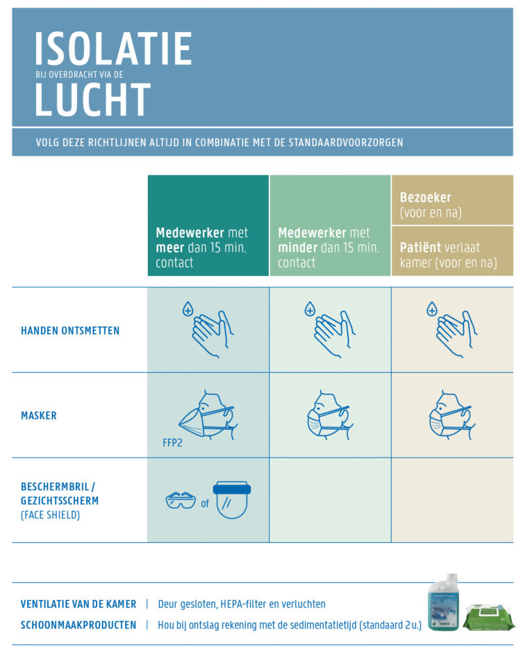 Isolatie lucht plus, zoals bijvoorbeeld bij open long tuberculose wordt toegepast, vereist enkele strengere maatregelen zoals het dragen van een FFP2 masker ongeacht de duur van het contact.