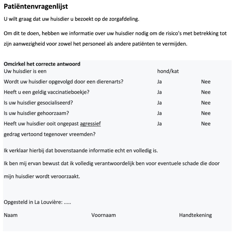 Hier is een voorbeeld van het document dat vooraf moet worden ondertekend door de persoon die verantwoordelijk is voor het dier en dat vervolgens aan het dossier van de patiënt wordt toegevoegd om redenen van traceerbaarheid.